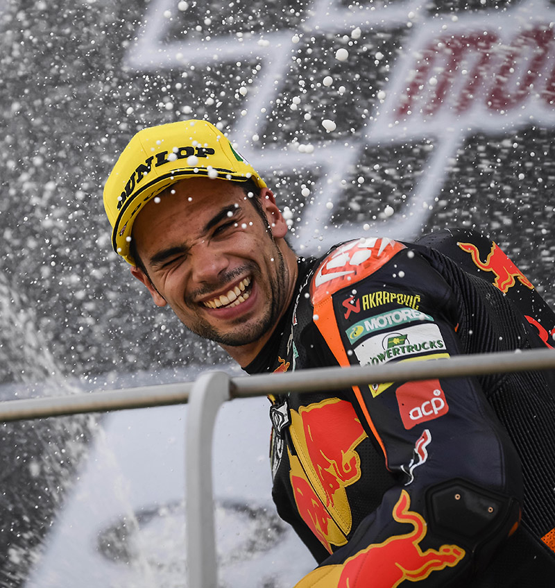 In Moto2 il podio intero e ben 9 piloti della top ten (esclusa la 9° posizione) sono Domino. Prima vittoria stagionale per Miguel Oliveira (Red Bull Ajo KTM): dopo 3 podi nelle precedenti 5 gare, il portoghese è finalmente riuscito a centrare il bersaglio aggiudicandosi la vittoria nel duello finale con Lorenzo Baldassarri (Pons HP 40). Terzo posto e secondo podio consecutivo per Joan Mir (EG 0,0 Marc VDS Racing), che dopo una gara in rimonta ha avuto la meglio su Francesco Bagnaia (Sky Racing Team VR46), sofferente ad un polso ma grande lottatore sino alla fine per il podio. Ha chiuso la top five il compagno di squadra di Mir, lo spagnolo Alex Marquez. Sesta posizione per Brad Binder (Red Bull KTM Ajo), seguito da Luca Marini (SKY Racing Team VR46). Bellissima prestazione per Andrea Locatelli con Italtrans Racing Team: in un weekend in costante crescita, il bergamasco è riuscito a concretizzare il duro lavoro portando a casa il suo miglior risultato in Moto2. Infine, chiude la top ten Simone Corsi con il Tasca Racing Scuderia Moto2. Ritirati dopo un buon inizio gara Mattia Pasini e Romano Fenati: il primo è scivolato mentre era al comando, mentre il secondo ha dovuto arrendersi a un braccio dolorante e problemi ai freni.