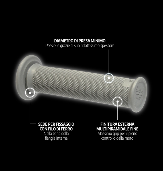 • finitura esterna multipiramidale fine, che, associata al diametro di presa, assicura il massimo grip per il pieno controllo della moto;